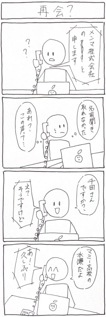 Home › 2026年 › 再会? 2026-04-07 再会? 解説 ① ② ③名前が聞き取れなかったが、声で千田さんだと確信する。 ④電話の相手が高校の同級生だった。 関連記事 日常 スカウト ホスト 退職代行 正夢 スカウト 日常