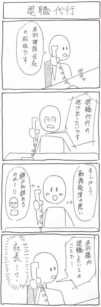 Home › 2026年 › 退職代行 2026-03-17 退職代行 解説 ① ② ③ ④赤羽建設会社の赤羽社長が退職代行を使って自分の会社を辞めようとしている。 関連記事 正夢 人間アイスドリル 商売上手 もっといい方法がある ホラーゲーム 正夢